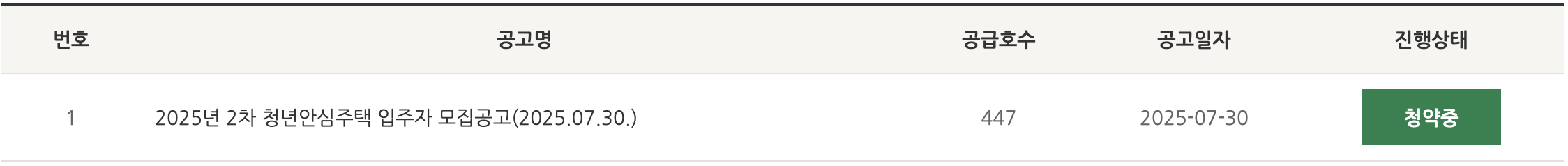 | 공고명 | 2025년 2차 청년안심주택(공공임대) 입주자 모집공고 (구, 역세권청년주택) |