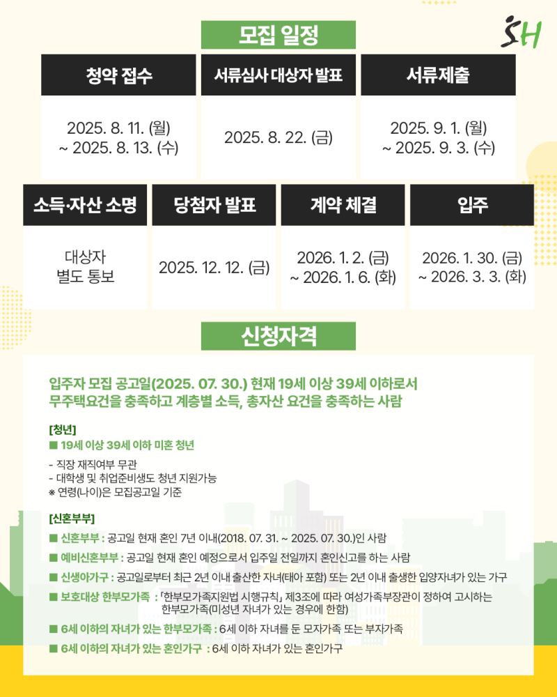 | 신청자격 | - 공고일 기준 만 19세 이상~39세 이하 청년- 무주택자- 계층별 소득·총자산 요건 충족- 청년, 신혼부부 가능 |