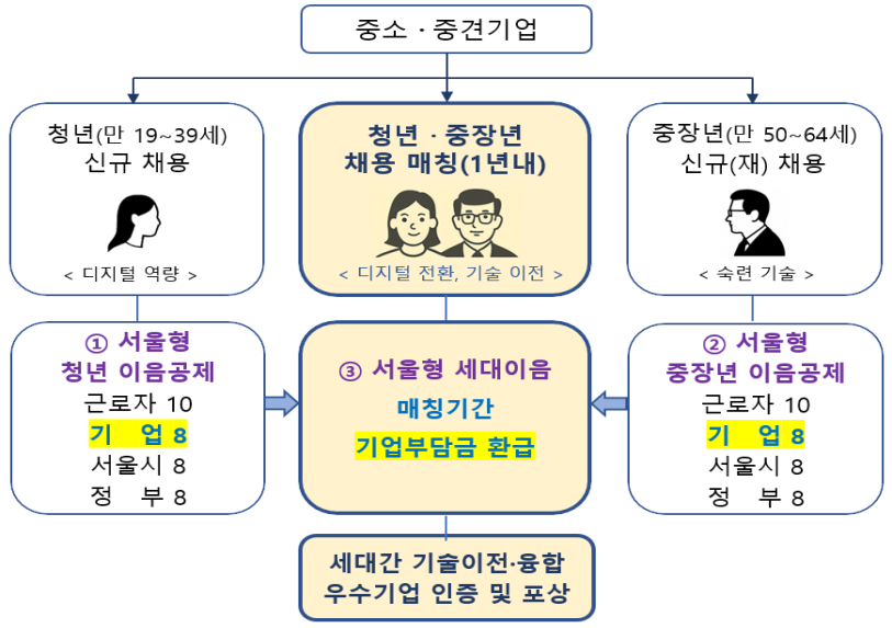 이 프로그램은 서울시가 주관하며, 중소기업이 청년과 중장년을 채용할 경우 재정적 지원을 통해 고용을 장려합니다.
